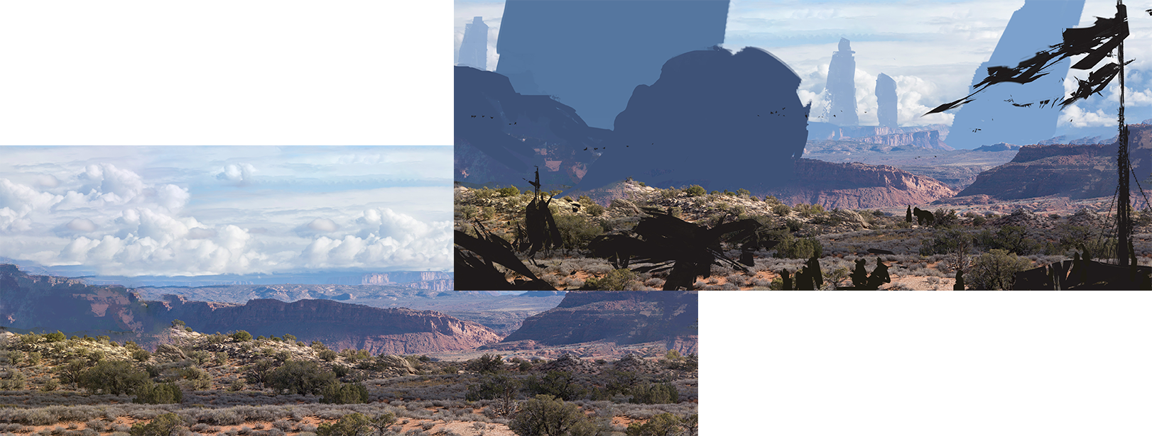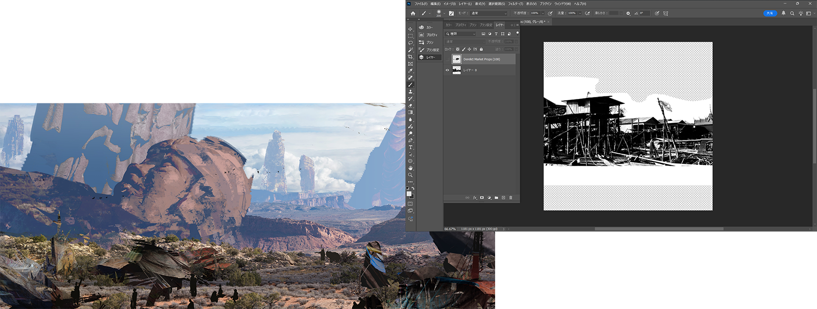 多くのアイデアの中から的確なものを採用し、制作を良い方向に進めていくためには、コンセプトが明確になっていることが重要です。コンセプトがあることで、構図、プロップ(小道具)のデザイン、世界観、雰囲気といった絵作りの主要なポイントで迷走することを防げます。そのコンセプトを基に具体的な絵作りを決定していくプロセスを実演でお見せします。