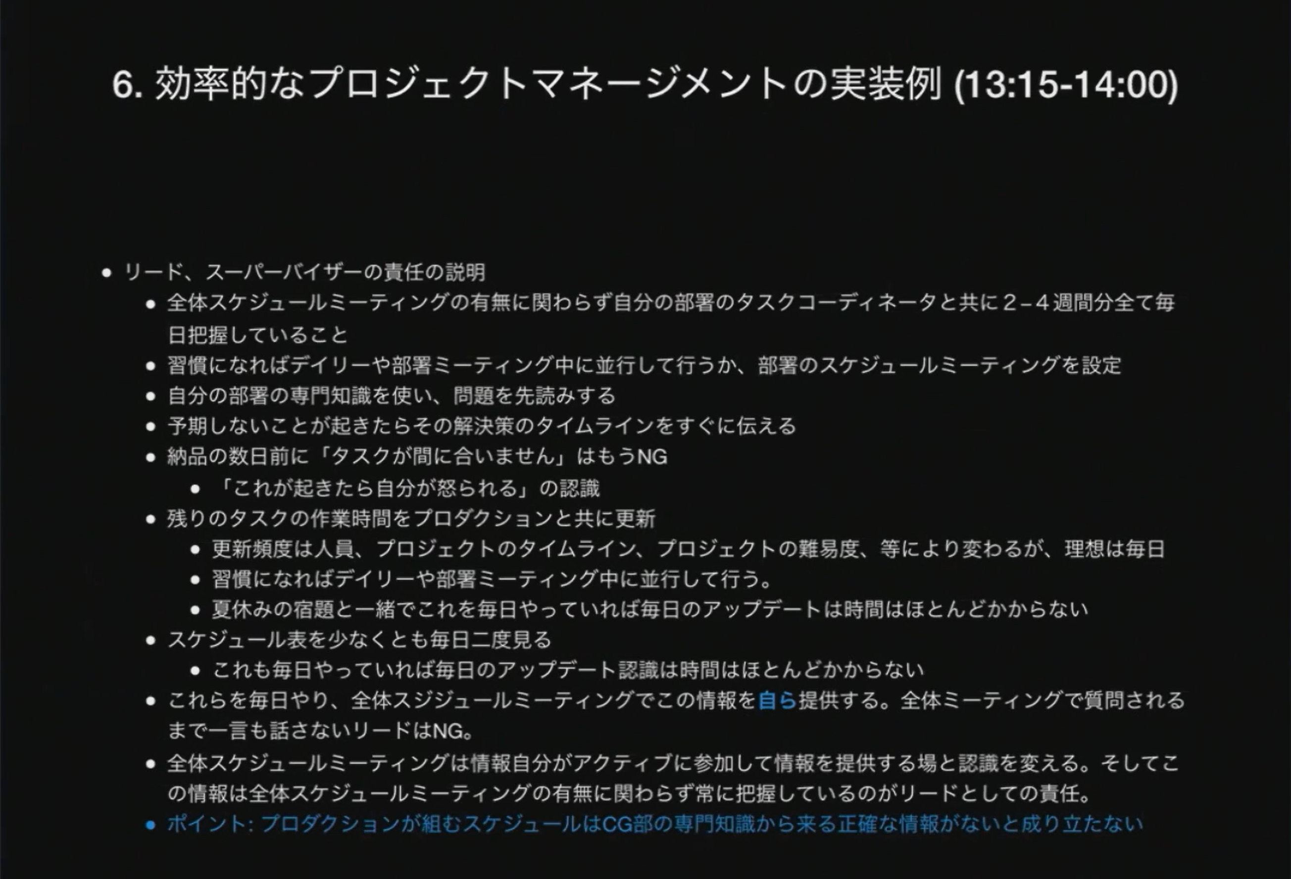 本講座では、CGディレクターとして私がプロジェクトの危機管理を担う際に用いている、「スケジューリング」や「ミーティング構成」などを含めた、プロジェクトを円滑に進めるためのロジックをご紹介します。