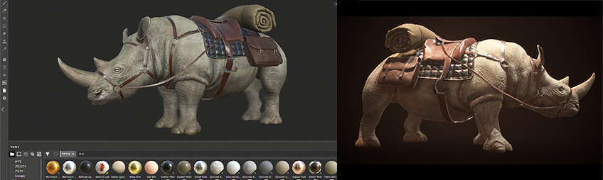 作例には様々な装備を付けたサイのモデルを使用し、皮膚、革、鉄、布など異なる質感をPBRテクスチャで表現します。